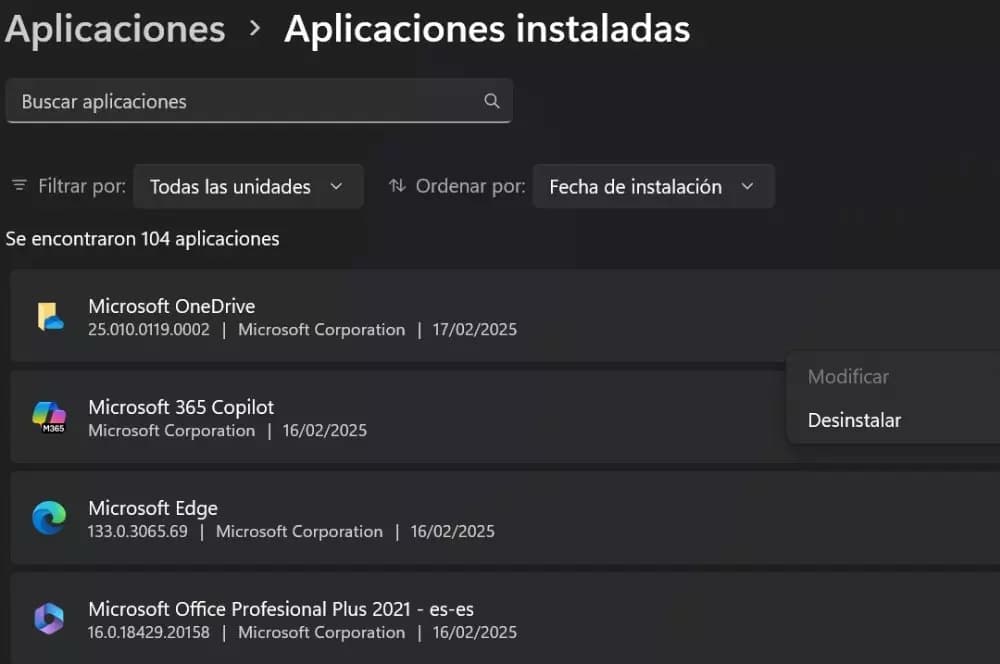 Cuando ya la localices, pulsa en los tres puntitos y aparecerá la opción de Desinstalar. Si te pregunta que OneDrive va a hacer cambios en tu PC, confirma la acción y reinicia para que esta modificación surta efecto. Ahora ya no verás ventanas emergentes de OneDrive por ninguna parte.