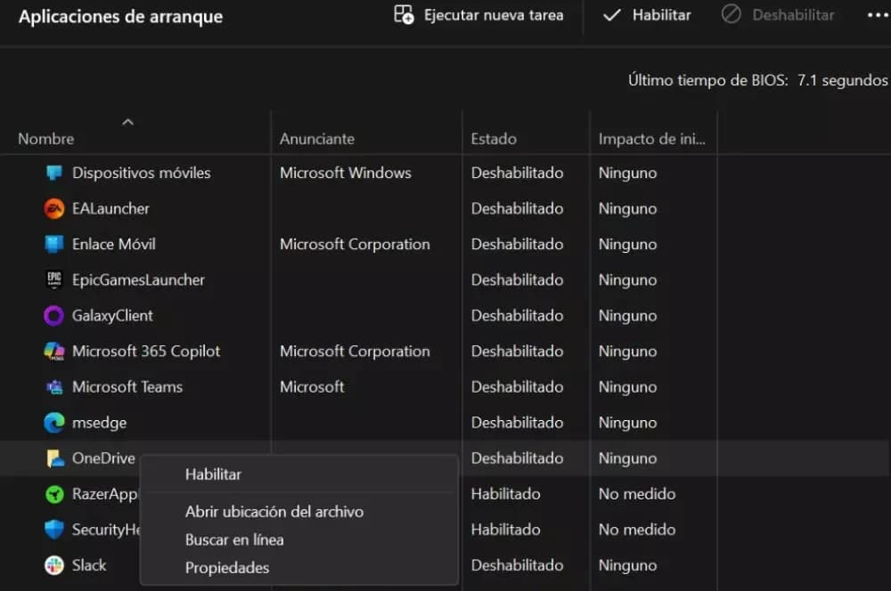 También puedes ir al Administrador de Tareas y dirigirte a Aplicaciones de arranque para que OneDrive no se ejecute al iniciar tu ordenador, así que con el botón derecho elige Deshabilitar.
