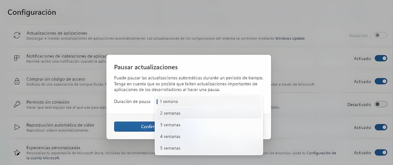 La única opción para salir del apuro y no tener que actualizar las aplicaciones de manera obligatoria es sacar partido de la nueva opción de retrasar las actualizaciones. Pero hay que tener en cuenta que se trata de un sistema que, simplemente, retrasa las actualizaciones durante un periodo determinado de tiempo. Por lo tanto, no las pone en pausa de forma permanente, sino que las aplaza. El rango que proporciona la Microsoft Store para que retrases las actualizaciones es de entre una y cinco semanas. A partir de ese periodo de tiempo ya no habrá opción y las actualizaciones llegarán de manera obligatoria a cada una de las aplicaciones.