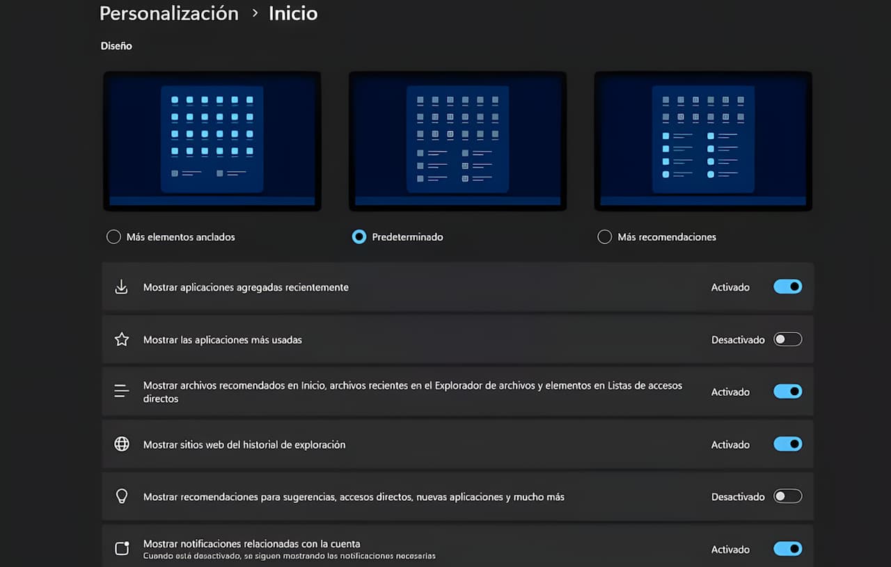 - Desmarcar Mostrar recomendaciones para sugerencias, accesos directos, nuevas aplicaciones y mucho más.