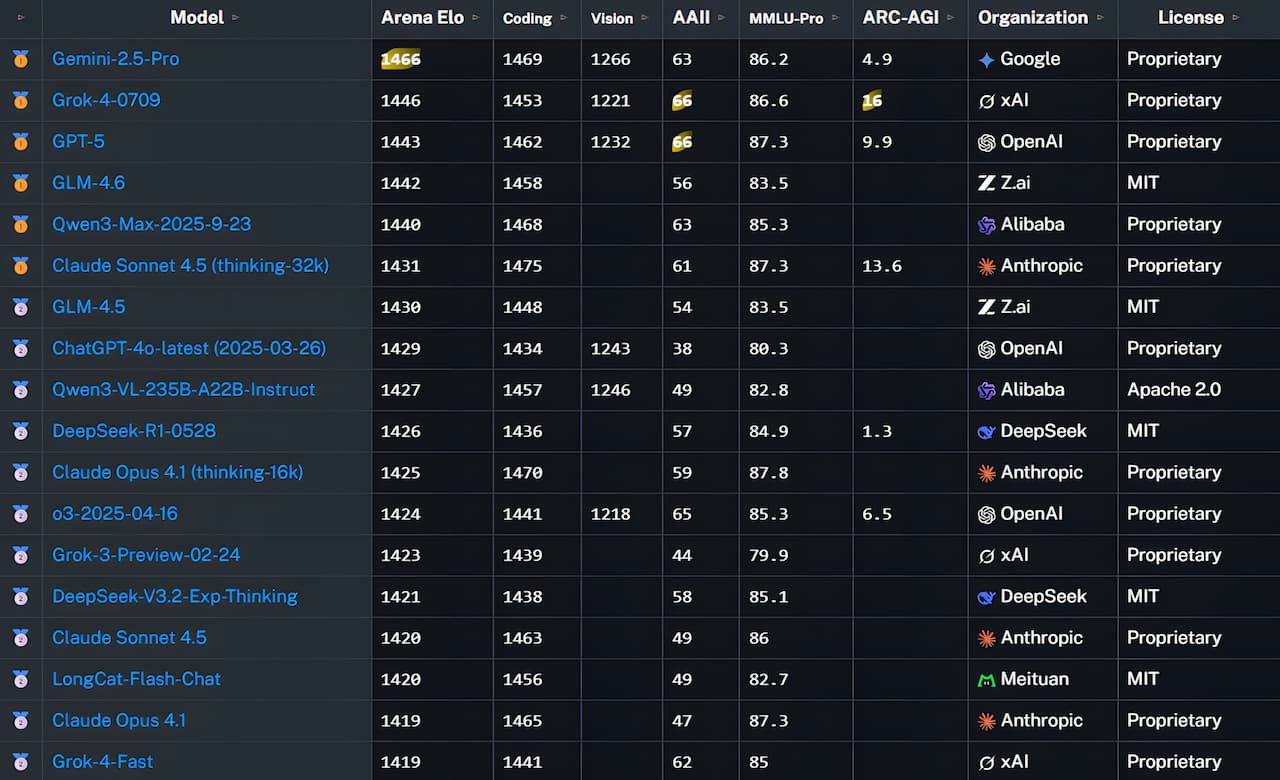 Aunque nos hemos centrado en ver a los modelos más conocidos por todos como Gemini 2.5 Pro de Google, GPT-5 (OpenAI), Claude Sonnet 4.5 (Anthropic) y Grok-4-0709 (xAI), lo cierto es que el ranking esconde muchas cosas que analizar. Seguro que a muchos les sorprende ver en cuarta y quinta posición, por encima de Claude, a dos inteligencias artificiales chinas.