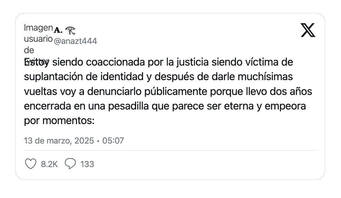 «Estoy siendo coaccionada por la justicia siendo víctima de suplantación de identidad y después de darle muchísimas vueltas voy a denunciarlo públicamente porque llevo dos años encerrada en una pesadilla que parece ser eterna y empeora por momentos». Así comienza el hilo de X de @anazt444 en el que cuenta que hace tres años le robaron los datos de su DNI, fotos suyas y su cuenta del banco en una estafa. Fue entonces cuando comenzaron unos problemas con la justicia que duran hasta la actualidad.