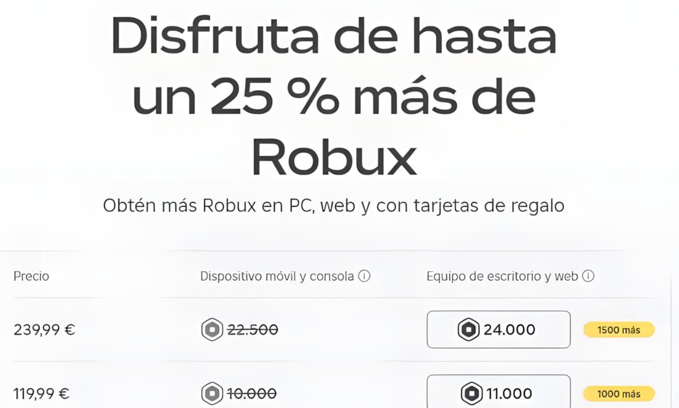 Eso sí, como decíamos, hay una serie de factores a tener en cuenta. Lo más importante es que obtendrás el 25% adicional de Robux o no dependiendo de dónde hagas su compra. Así, se incluye el extra tanto si haces la compra dentro del propio juego como si utilizas la versión web de Roblox o si recurres a las famosas tarjetas regalo que no pasan de moda. Por lo tanto, los únicos métodos que se quedan fuera de la ecuación son las compras de Robux a través de Google Play en Android y de App Store en dispositivos de Apple. En esos casos, no tendrás el 25% adicional y, por lo tanto, será menos recomendable hacer la compra.