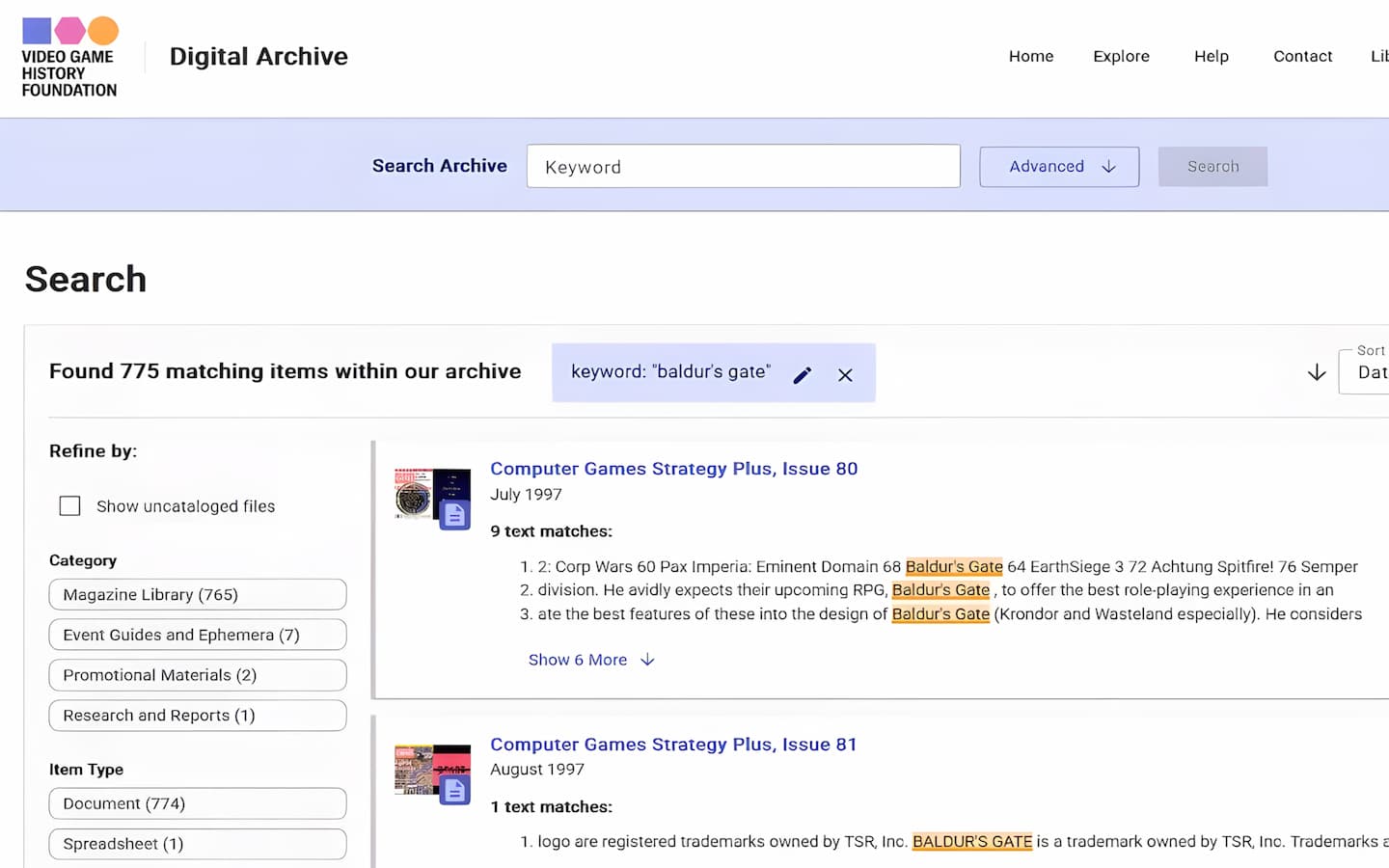 En total, más de 1500 revistas de videojuegos agotadas con búsqueda de texto completo, incluidas revistas comerciales de la industria de los videojuegos que rara vez están disponibles para el público.