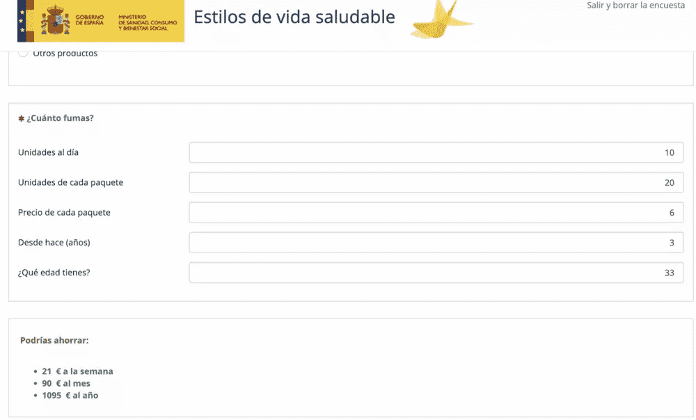 La encuesta se compone de diferentes apartados. En el primero de ellos, debemos decir si fumamos cigarrillos, tabaco de liar, puros o pipas. Una vez hecha la elección, es el momento de pasar a la cantidad. La aplicación nos ofrece la opción de introducir cuánto fumamos en unidades al día, cantidad de paquetes, el precio de cada uno de los paquetes y los años que llevamos fumando. Además, también nos pregunta la edad para hacer el cálculo del dinero gastado. Una vez proporcionada toda la información, aparece en la parte inferior cuánto podríamos ahorrar a la semana, al mes y al año.