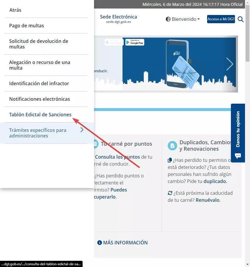 En la página web de la DGT podemos realizar una gran cantidad de gestiones sin necesidad de salir de casa. Para ello, lo que tenemos que hacer es entrar a la página web de la DGT, en el siguiente enlace, y abrir el menú desplegable de la izquierda. En él encontraremos una opción llamada «Multas», sobre la que haremos clic para llegar a un apartado llamado «Tablón Edictal de Sanciones«.