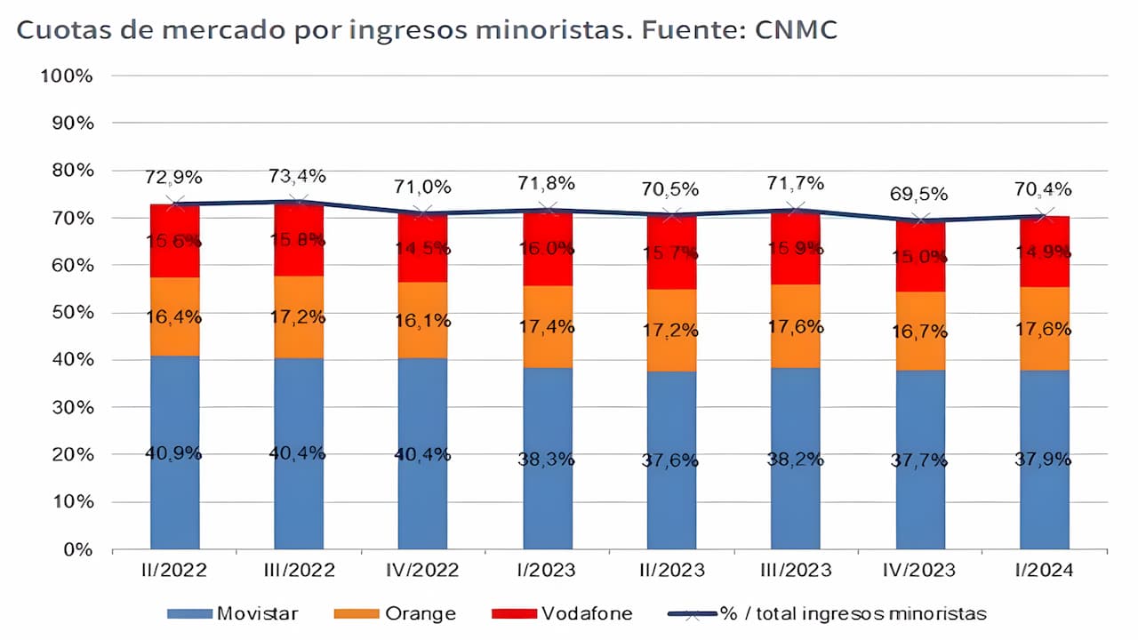 Es decir, las operadoras Movistar, Orange y Vodafone han bajado 1,7 puntos su presencia en el mercado de la banda ancha móvil de los tres primeros meses del 2023 a los de 2024.