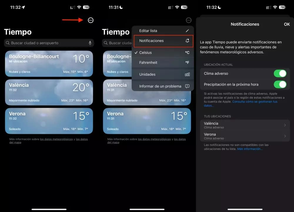 Una vez hecho esto, nos dirigimos a la app de Tiempo. Tenemos que pulsar sobre el botón que está situado en la parte superior derecha representado por tres puntos en horizontal. Acto seguido, pulsamos sobre “Notificaciones”. Por último, tenemos que asegurarnos de que la función de “Clima adverso” está habilitada para las ubicaciones que nos interesan. Lo más importante es que las tengamos siempre activadas en nuestra ubicación actual, pero también puede ser útil establecer ubicaciones secundarias para advertir a nuestra familia o amigos cuando las recibamos.