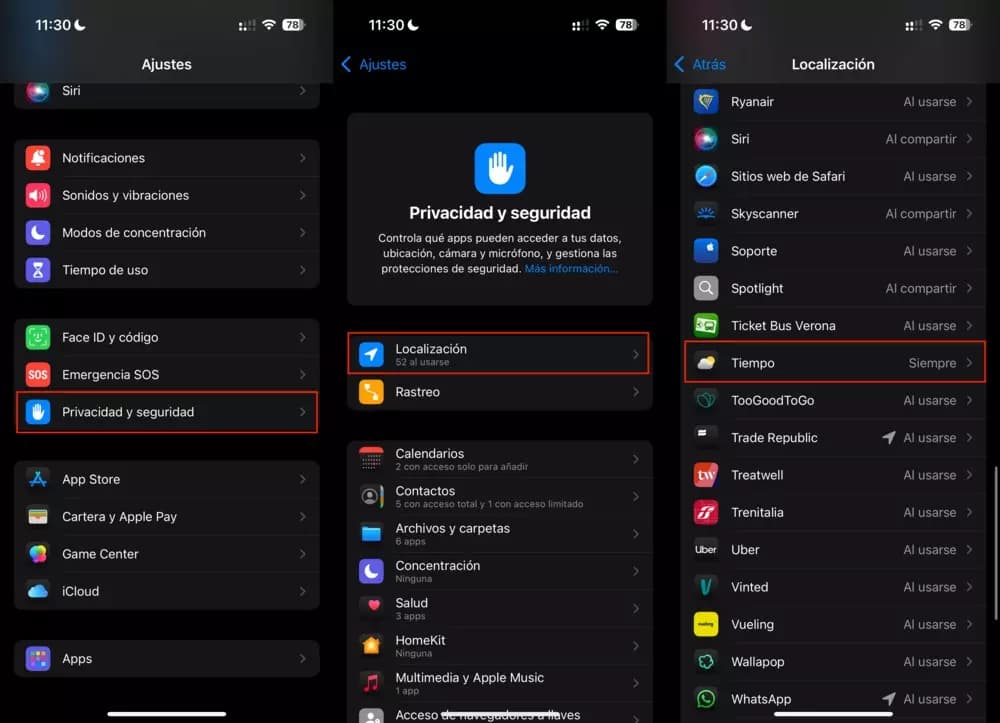 En iOS, lo tenemos muy fácil para activar estas alertas, puesto que todo queda integrado a través de la app de Tiempo que viene instalada en todos los terminales de Apple. Lo primero que debemos hacer es activar la localización en dicha app. Para ello, debemos abrir la app de “Ajustes”, acudir a “Privacidad y seguridad“ y, acto seguido, tocar sobre “Localización”. Una vez allí, aparecerá un listado con todas las aplicaciones que tienen acceso a esta información, debemos cambiar los ajustes de la app de Tiempo a “Siempre”, como podemos ver en la siguiente imagen.