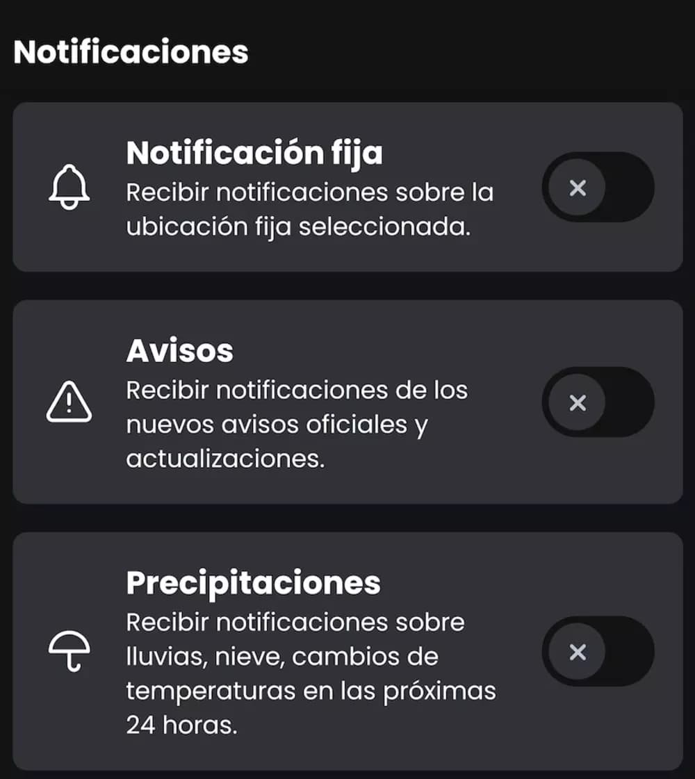 Te recomendamos que siempre tengas habilitada la función de Precipitaciones, que te permitirá recibir notificaciones sobre lluvias, nieve o cambios de temperatura durante las próximas 24 horas. De este modo, estarás siempre alerta sobre posibles cambios en el clima que se puedan producir en tu ubicación. Recuerda tener siempre habilitada la pestaña de “Mi Ubicación”, para que puedas recibir una previsión mucho más precisa.