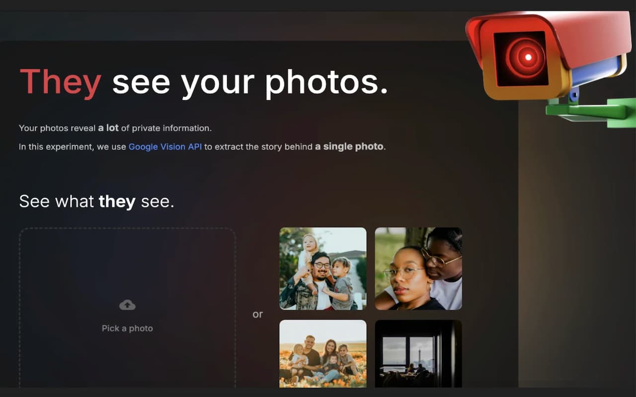 Tal y como se indica en esta web, llamada Theyseeyourphotos (Ellos ven tus fotos), el portal usa «la API de Google Vision para extraer la historia detrás de una sola foto». Así, se le permite a cualquier ver qué es capaz de hacer esta tecnología.