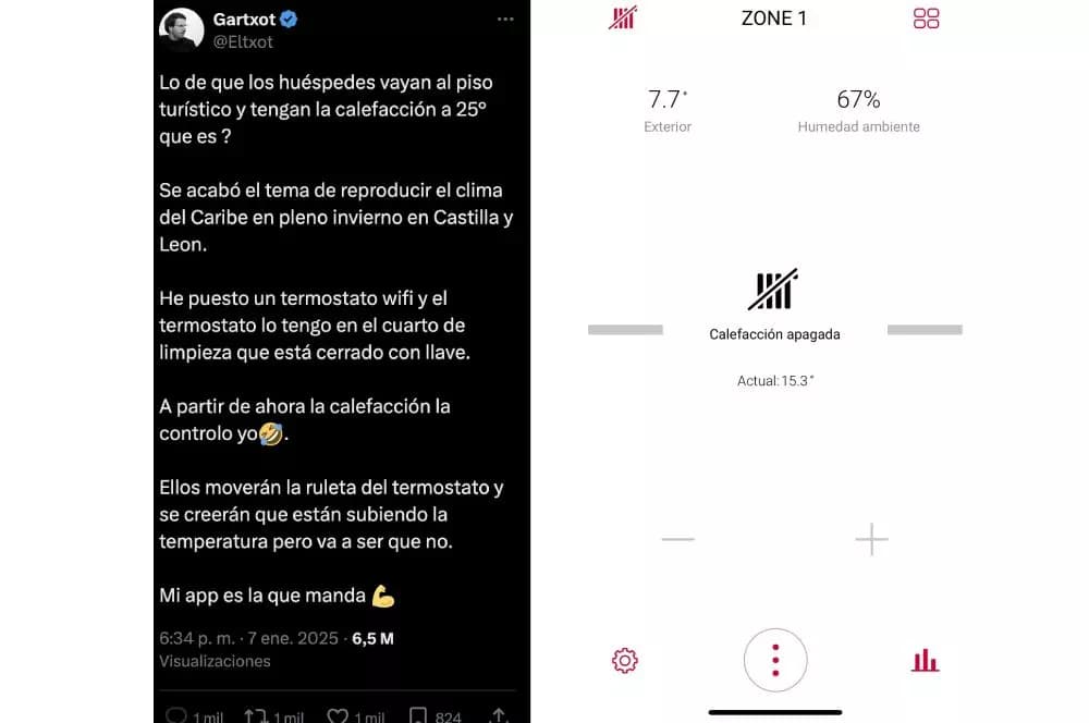 El pasado 7 de enero, el usuario Gartxot publicó: «¿Lo de que los huéspedes vayan al piso turístico y tengan la calefacción a 25 grados qué es? Se acabó el tema de reproducir el clima del Caribe en pleno invierno en Castilla y León. He puesto un termostato wifi y el termostato lo tengo en el cuarto de limpieza que está cerrado con llave», escribió, adjuntando en el post una captura de pantalla de la aplicación móvil que usa para regular la temperatura del termostato.