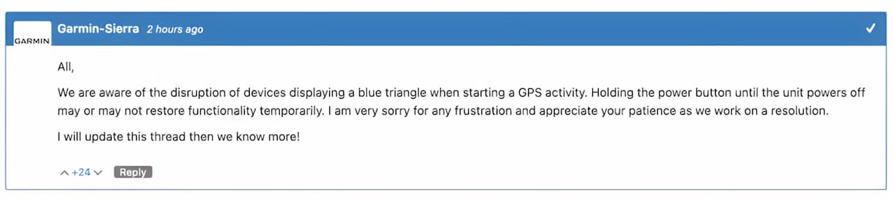 Como podemos ver en la imagen que adjuntamos a continuación, y que la hemos obtenido del foro oficial de Garmin, la compañía ha reconocido el problema. Al mismo tiempo, también ha afirmado que su equipo de especialistas está trabajando en encontrar una solución lo más pronto posible. Sin embargo, de momento no han podido dar algún plazo al resto de los usuarios sobre el tiempo estimado que tardarán en resolverlo, como es habitual ante este tipo de incidencias.