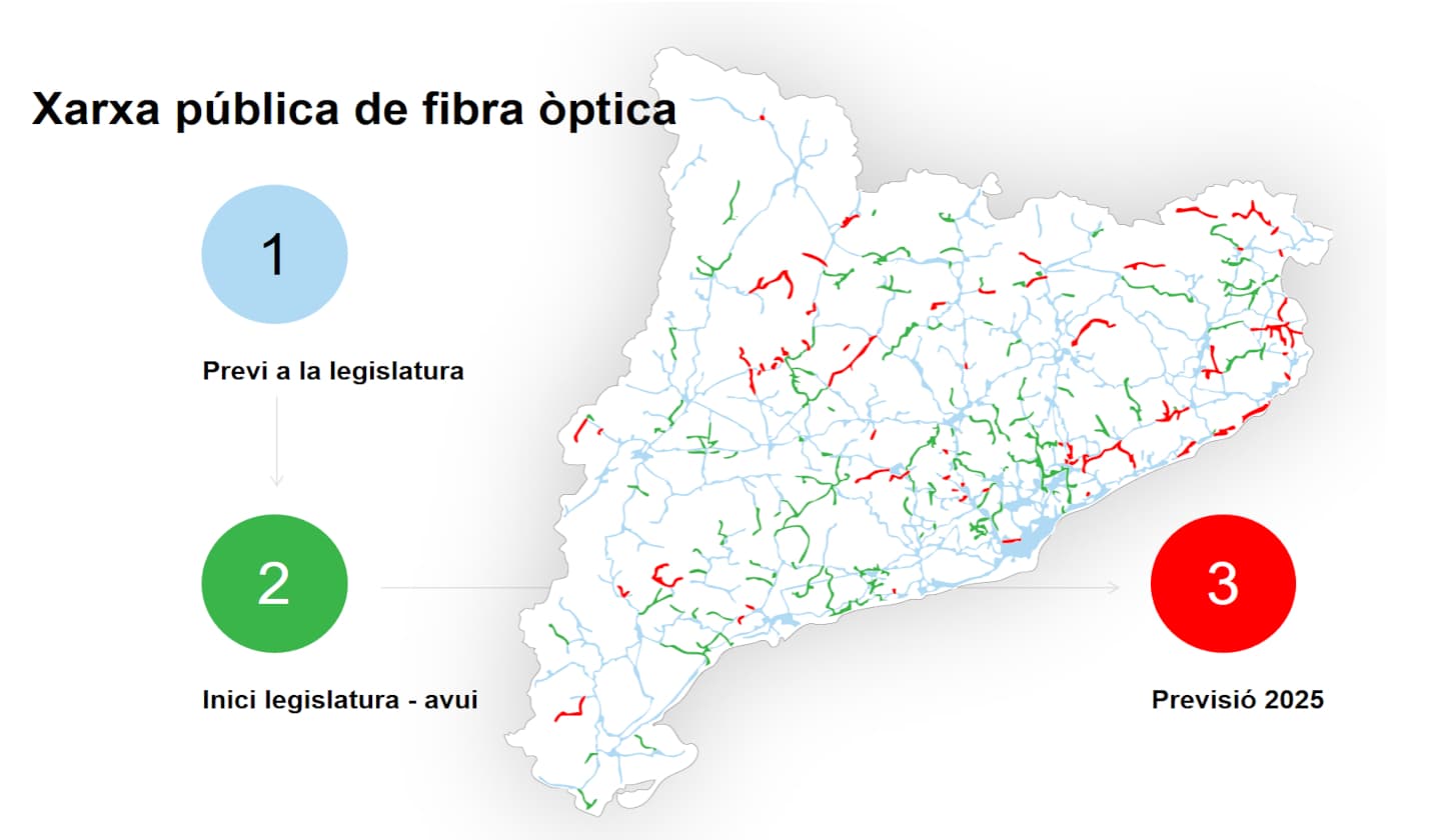 El Gobierno catalán ha anunciado que se plantea como objetivo para la actual legislatura hacer llevar la red pública de fibra óptica a un 100% de municipios, logrando un total de 738 municipios conectados (el 78%) a finales de 2025. Esto supone un aumento en la red de 1.400 kilómetros, superando así los 8.000.