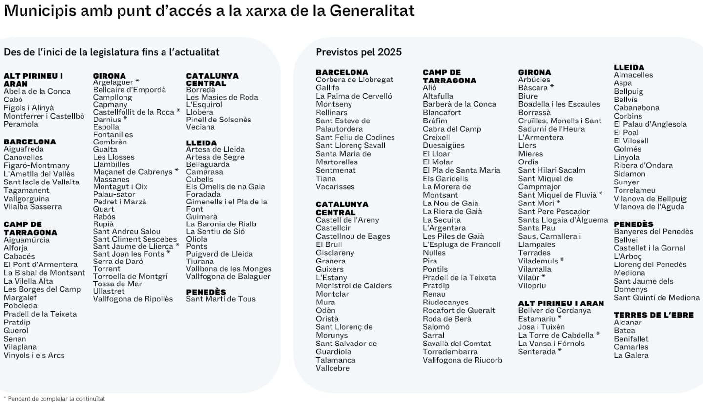 El Govern ha compartido también una lista de todos los municipios a los que prevén llegar con su red pública para este 2025, disponible en la siguiente imagen.