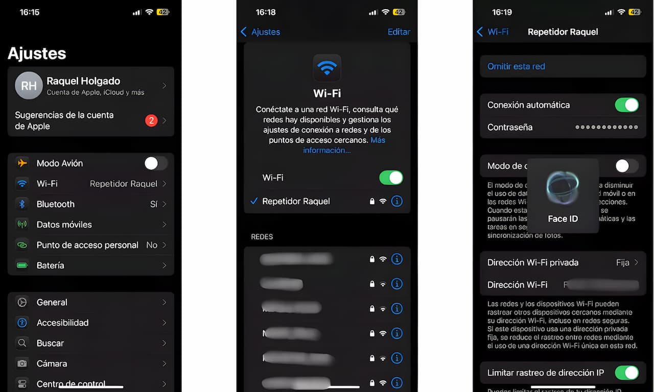 El primer paso será entrar en la aplicación de Ajustes del smartphone. Una vez dentro, haz clic al apartado destinado al WiFi y selecciona la red de la que quieres conocer la contraseña (deberá ser una que ya tengas almacenada). De este modo, accederás a los datos de la conexión, pero la clave permanecerá oculta. Para mostrarla, el sistema utilizará Face ID para que verificar tu identidad y no compartirla con cualquiera. El iPhone da hasta dos intentos: si no reconoce tus datos biométricos, tendrás que utilizar la clave de desbloqueo del dispositivo.