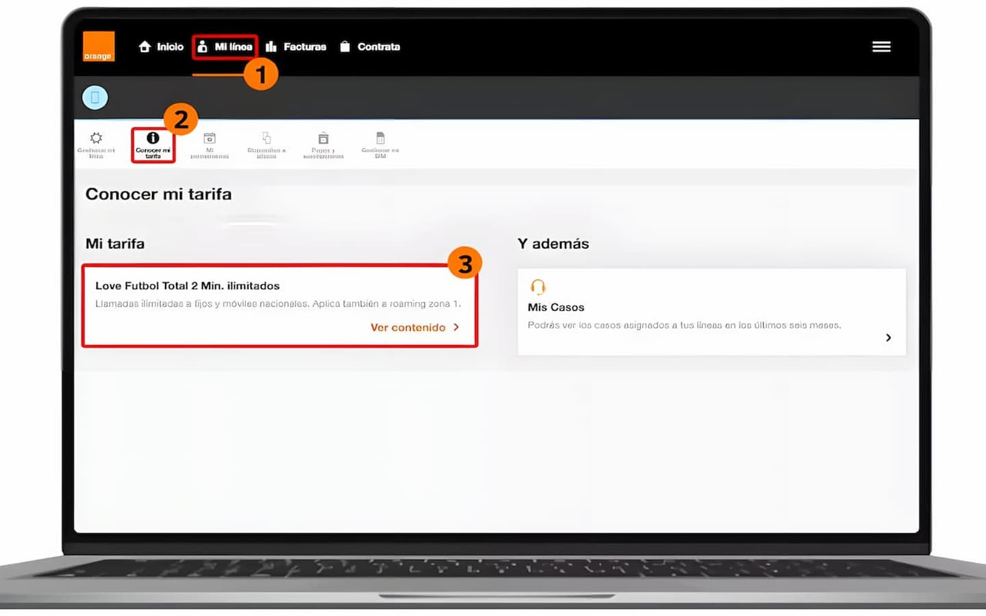 Una vez con la sesión iniciada, selecciona el apartado «Mi línea» y haz clic en «Conocer mi tarifa«. En este punto, tocará pulsar sobre «Ver contenido». Desde ahí, Orange te mostrará un resumen de las características contratadas de forma muy detallada, como aparece en la imagen de abajo.