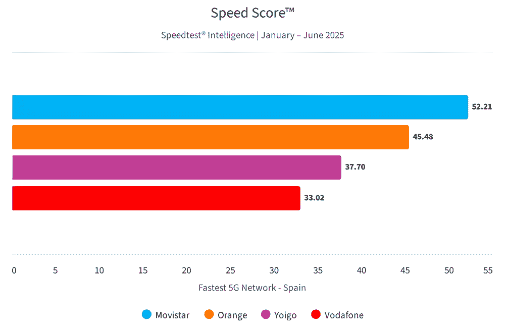 En este informe también se analiza la mejor conexión a través de la banda ancha fija, pero nos vamos a centrar exclusivamente en las redes móviles. En ese caso, Ookla tiene en cuenta la cobertura de Movistar, Orange, Vodafone y Yoigo –la red móvil de Yoigo se apagó en agosto de 2025 tras casi 20 años operativa-.
