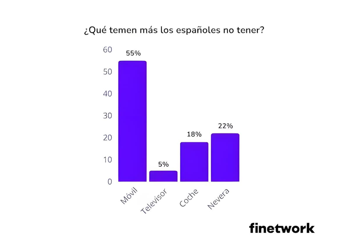 Aprovechando que mañana es Halloween, Finetwork ha compartido los resultados de un estudio en el que da a conocer los peores temores en la era digital. Para ello, la operadora ha encuestado a más de 1.250 personas de España sobre el hipotético caso en el que se quedasen sin un dispositivo. El 55% (más de la mitad) afirmaba que lo que peor llevarían sería quedarse sin móvil. Mientras tanto, solo el 22% destacaba estar sin nevera; el 18% sin coche; y el 5% sin televisión.