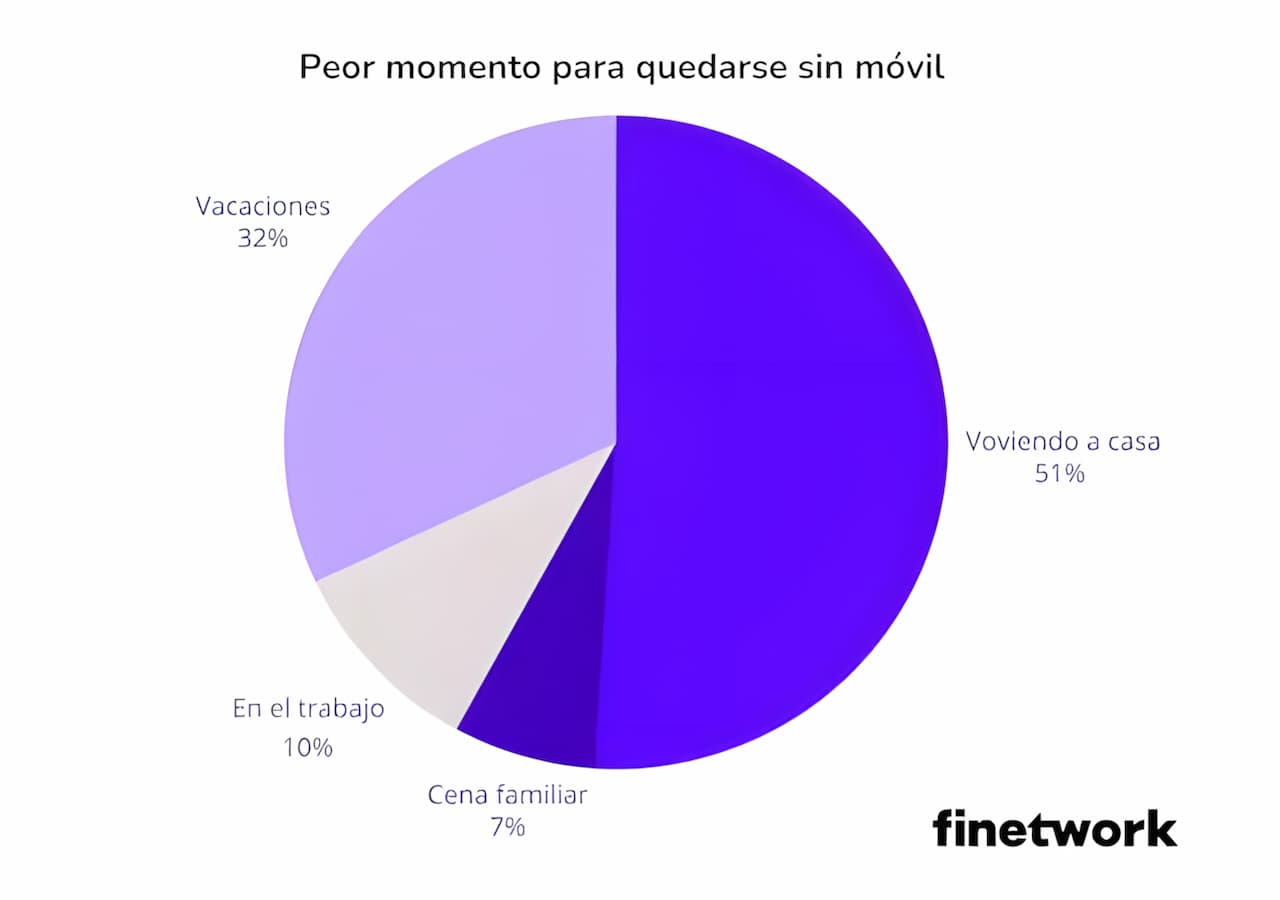 La preocupación de quedarse sin móvil depende de las situaciones en las que los usuarios se encuentren. Por ejemplo, el 51% recalcaba que el peor momento sería volviendo a casa. Cuando estamos en la calle, no tenemos otras formas de entretenimiento o de comunicación con personas de nuestro entorno, por lo que es normal que haya quien valore esto como su mayor temor. En especial, nos gusta mantenernos conectados por si nos ocurre algo tener una manera de comunicarnos. Sin embargo, también es esencial si hemos quedado con alguien, para saber si llegan tarde o algo parecido.