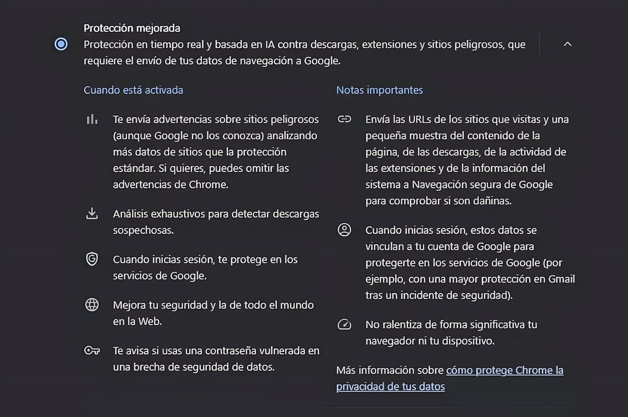 Tal y como explican en Google Chrome, recurrir a la «Protección mejorada» hará que se analicen las páginas en tiempo real con ayuda de la inteligencia artificial (IA). La herramienta está especialmente diseñada para evitar las descargas, extensiones y sitios peligrosos. Pero requiere el envío de tus datos de navegación a Google. Depende del usuario valorar si merece la pena o no activar esta opción, aunque está valorada como la que más protección ofrece frente a posibles ciberataques.