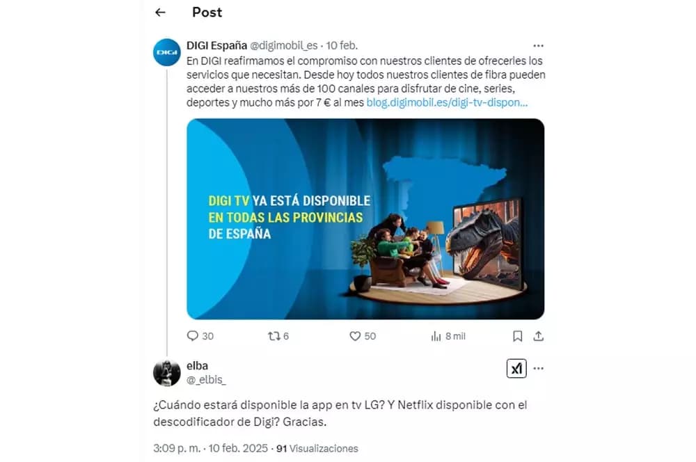 No se trata de incluir esta plataforma de streaming a su oferta por 7 euros al mes, sino al hecho de que los clientes no pueden instalar la app de esta plataforma en el propio decodificador. Algo que no ocurre en el resto de decos de otros operadores. Por lo que es un punto que se lleva repitiendo desde el pasado mes de diciembre, cuando se lanzó el primer descodificador en Digi.