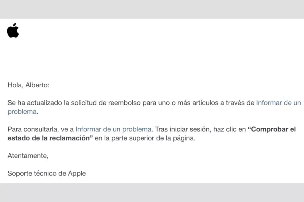 Y listo. En un plazo de uno a dos días, deberías recibir un correo de Apple diciéndote que se ha tomado una decisión sobre tu solicitud. Puedes entrar a la web Report a problem de nuevo, sección «Comprobar el estado de la reclamación» para ver el resultado, y allí sabrá si te han concedido la devolución del importe o si la han denegado. A mí nunca me han negado una devolución, por lo que nunca he tenido que llegar más allá.