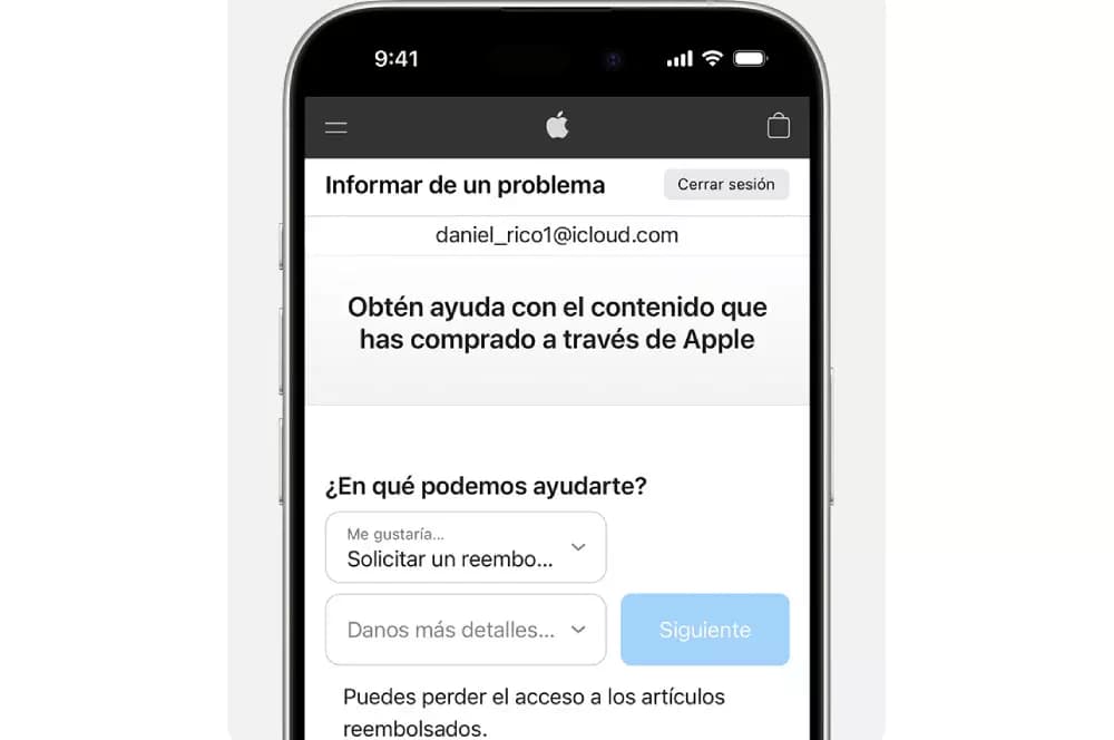 Es bastante sencillo. Después de darnos cuenta de que se nos ha cobrado algo por lo que no era nuestra intención pagar, tenemos que ir a una sección de la web de Apple que se llama «Report a problem» (reportaproblem.apple.com), autenticándote con tu cuenta Apple. Allí, toca o haz clic en Me gustaría y, a continuación, elige Solicitar un reembolso. Elige el motivo por el que quieres un reembolso (yo he puesto que he hecho la compra por error) y, a continuación, selecciona Siguiente. Elige la app, suscripción u otro elemento por el que se te ha cobrado y, a continuación, selecciona Enviar.
