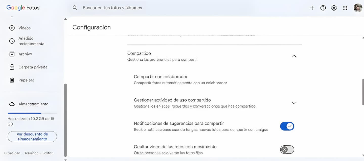 Basta con crear una segunda cuenta y compartir el contenido con la que tengas como principal. Desde tu nuevo perfil, entra en Google Fotos y dale a «Ajustes de Fotos» y, después, a «Compartido«. En la aplicación móvil, está en el menú desplegable que aparece cuando clicas a la foto de tu perfil y, en la web, aparece directamente la opción de «Compartido» al hacer clic al icono del engranaje de los ajustes.