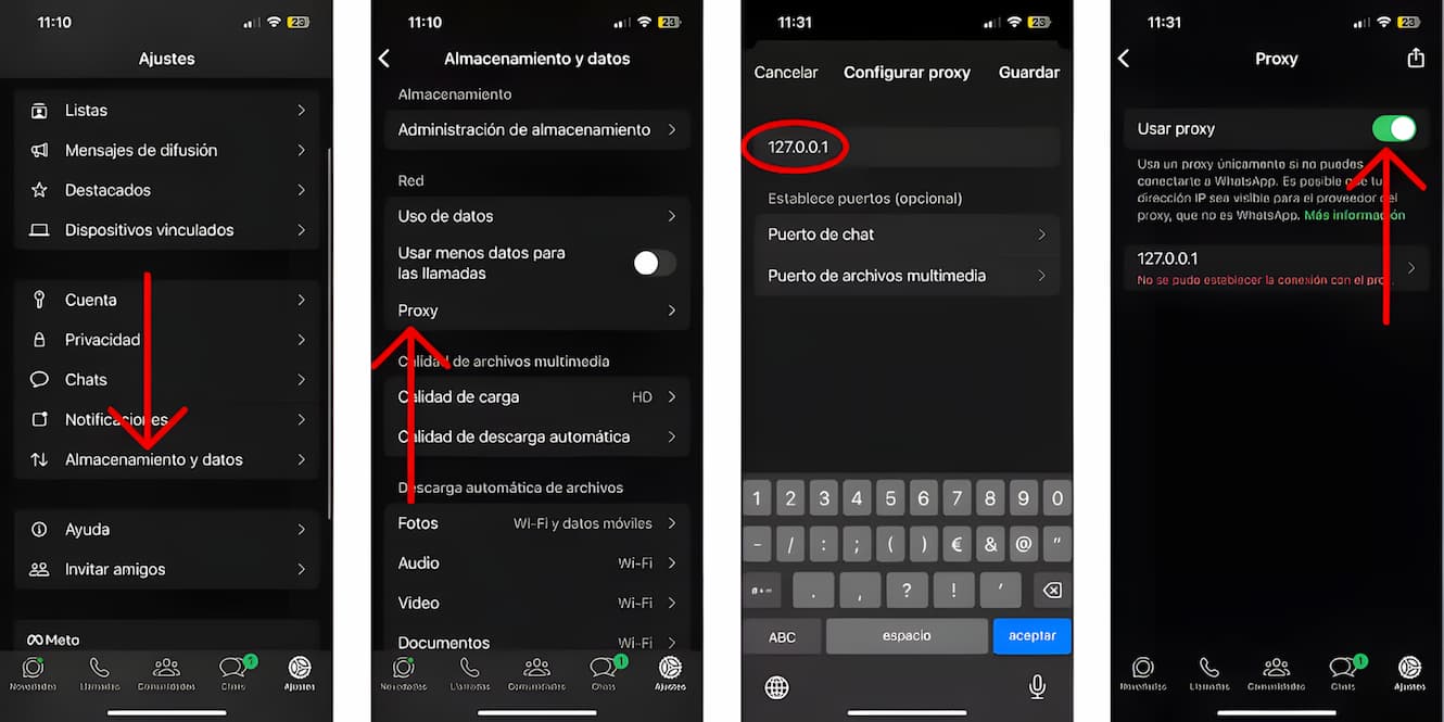 - Una vez ahí, configura el proxy escribiendo ‘127.0.0.1‘, guárdalo y activa la opción «Usar proxy«.