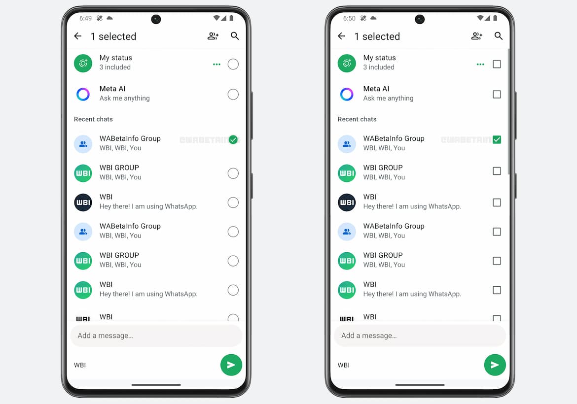 Según la publicación del portal WABetaInfo, a fecha de 26 de agosto de 2025, cada contacto dispondrá de casillas de marcación al lado de su nombre que podrían representarse con dos tipos de figuras: círculos o cuadrados. Al pulsar sobre ellas, se dibuja un signo de verificación en color verde para cerciorar al usuario de que ese contacto se ha seleccionado.