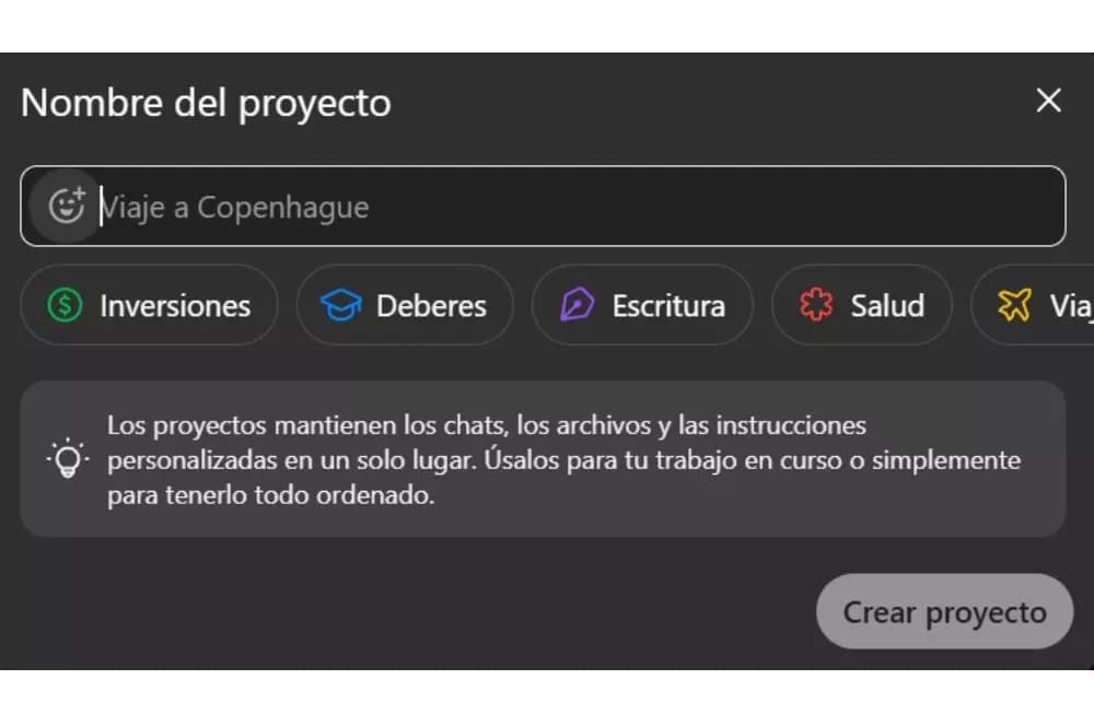 ChatGPT ha incluido cambios importantes a través de una publicación el 3 de septiembre de 2025 en su cuenta oficial de X y uno de ellos es la implementación gratuita de los Proyectos. Se trata de una herramienta que permite organizar tus chats, archivos y comandos de una manera más sencilla y cómoda en un único espacio. Según explica Open AI en la sección de ayuda de su página web, «añade instrucciones personalizadas para que ChatGPT recuerde lo importante y se mantenga centrado en el tema». Las principales operaciones que se pueden realizar están relacionadas con el ámbito de trabajo para redactar informes, escolar para recopilar tus apuntes en PDF, o personal para planificar eventos y planes futuros.