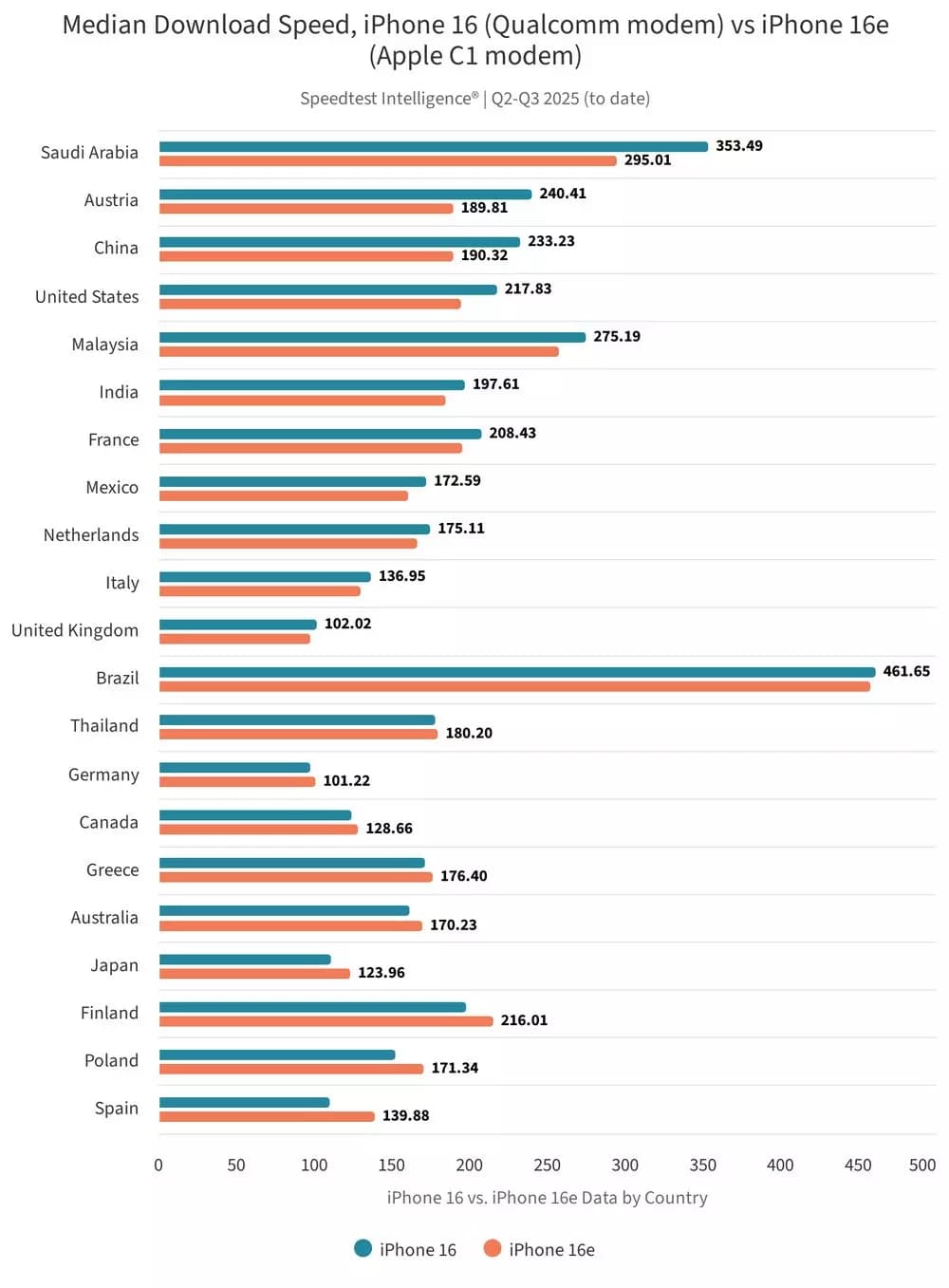 Según los análisis llevados a cabo por Ookla, el iPhone 16e con el módem Apple C1 y el iPhone 16 con el módem Qualcomm ha sido bastante similar en la mayoría de los países. Sin embargo, se han presentado importantes diferencias en ciertos mercados cuando se ha estudiado la velocidad media de descarga, como te explicamos a continuación.