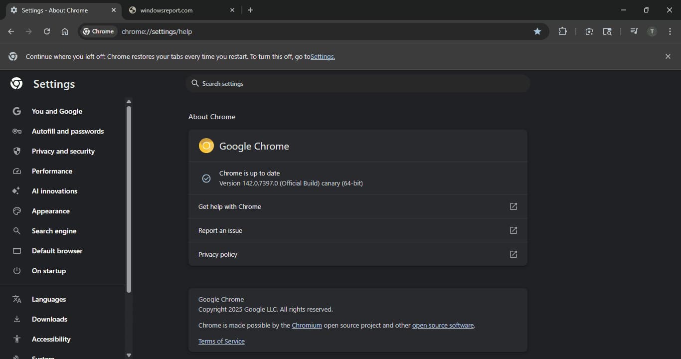«Continúa donde lo dejaste: Chrome restaura tus pestañas cada vez que reinicias. Para desactivar esta opción, ve a Configuración».