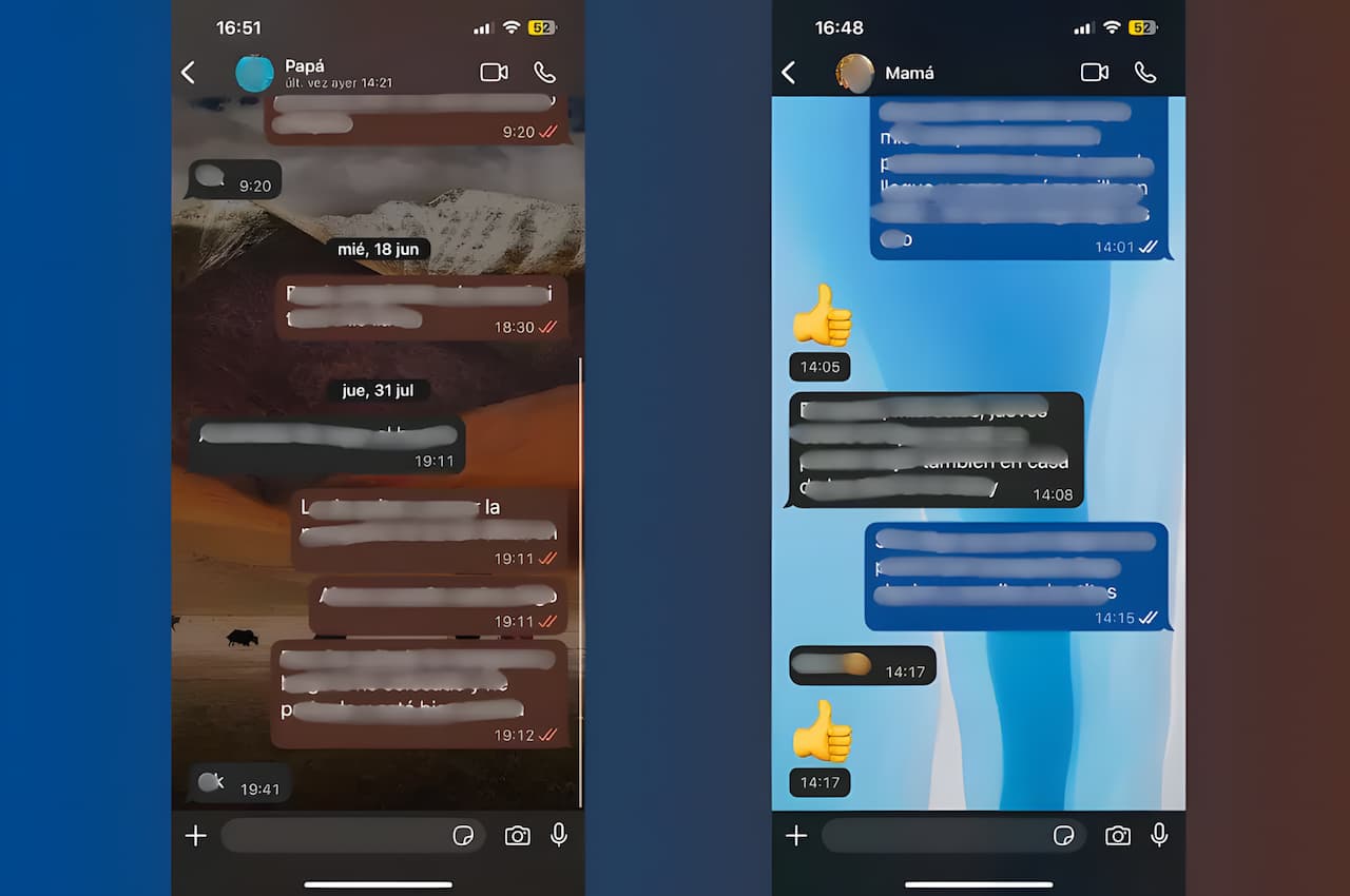 Sí. Es posible modificar el fondo de pantalla o color determinado solo de un chat, o poner uno distinto en cada conversación. De esta manera, no solo el nombre del grupo o contacto con el que hables te ayudará a identificar con quién estás hablando, sino que podrás asociar a una persona con un aspecto concreto en un chat. Por ejemplo, podrás guardar a tu madre con una paleta cromática azul y a tu padre con una en la que predomine el marrón, como puedes ver a continuación: