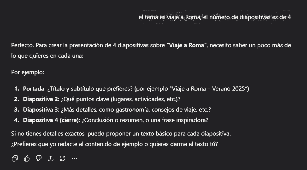 Ahora que ya conoces los datos que tienes que considerar, vamos a proceder con un ejemplo demostrativo. Si el tema va dirigido a un «Viaje a Roma» y el número de diapositivas va a ser de 4, el chatbot necesitará conocer toda la información al respecto: título y subtítulo, qué contenido se incluye en cada diapositiva (lugares, actividades, gastronomía…). En el caso de que no contengas detalles más precisos, ChatGPT siempre buscará la manera de elaborar un proyecto sencillo en el que figure un texto redactado por la propia IA.