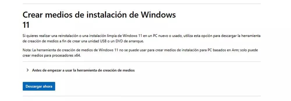 - Entra en la web de descargas de Microsoft aquí para instalar Media Creation Tool (Crear Medios de instalación).