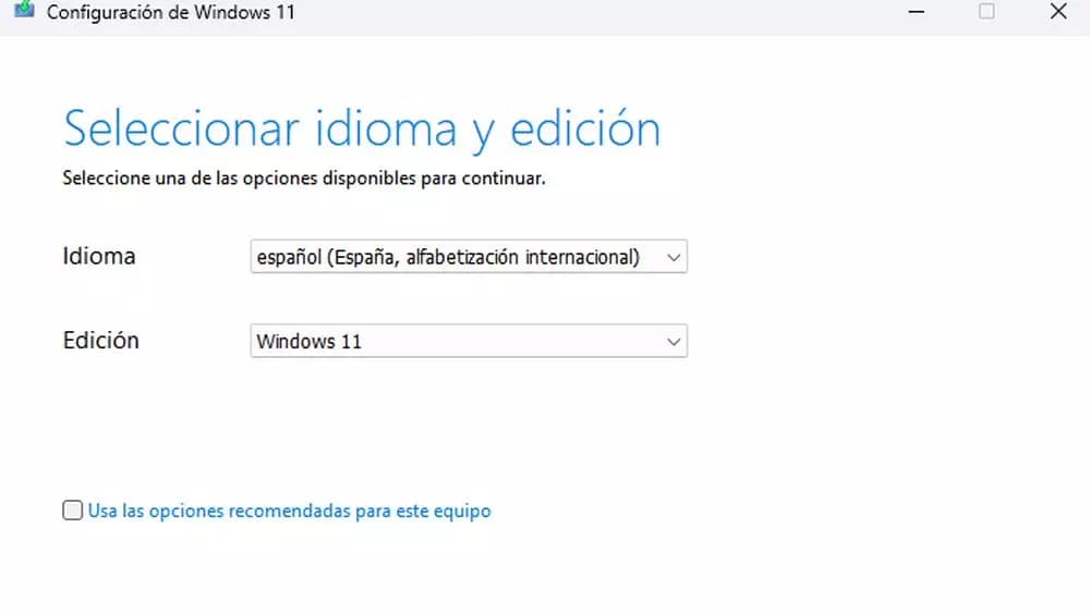- Elige el idioma en el que vas a hacer la instalación o deja marcada la opción «Usa las opciones recomendadas para este equipo»