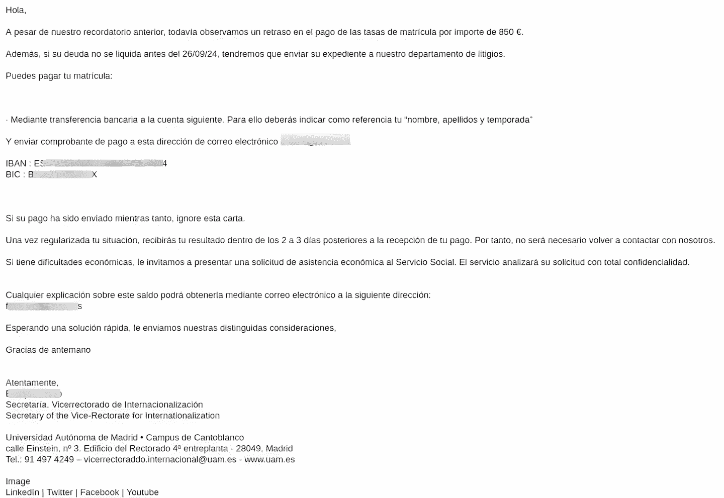 Como cada año, a mediados de septiembre, el calendario académico de las universidades españolas comienza a dar su pistoletazo de salida para empezar el nuevo curso. Pero unos meses antes, se debe echar la matrícula para realizar la prescripción en el centro donde se vaya a estudiar la carrera solicitada. Es en este preciso momento cuando los atacantes tiran de su ingenio para aprovechar la situación y poner en duda a su receptor, en este caso, el alumno universitario.