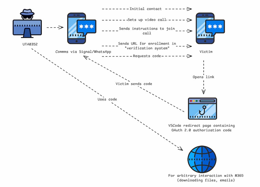 En esta amenaza, el hacker comienza haciéndose pasar por una persona de confianza, en este caso oficiales de los respectivos países a los que pertenecen las víctimas. Ese primer contacto lo lleva a cabo a través de herramientas de mensajería, como WhatsApp. Lo que intenta el hacker hablando con su víctima son dos posibles cosas. La primera de ellas es tratar de obtener los códigos de autorización de Microsoft, lo cual no hay duda de que puede llegar a ser muy complicado. La segunda de las maniobras consiste en lograr que la víctima haga clic en un enlace malicioso que le robará los códigos de acceso en cuestión.