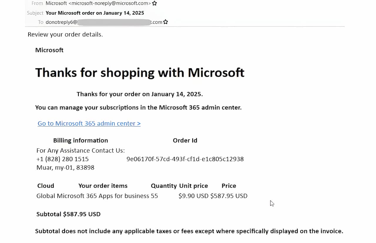 El importe de la falsa compra tenía un importe de 587,95 dólares por 55 licencias de Microsoft 365. La verdad es que el usuario no había comprado nada y su dinero estaba completamente a salvo. No obstante, el plan de los ciberdelincuentes es que cayesen en la trampa y llamasen al número del soporte técnico facilitado para reclamar un cobro indebido.