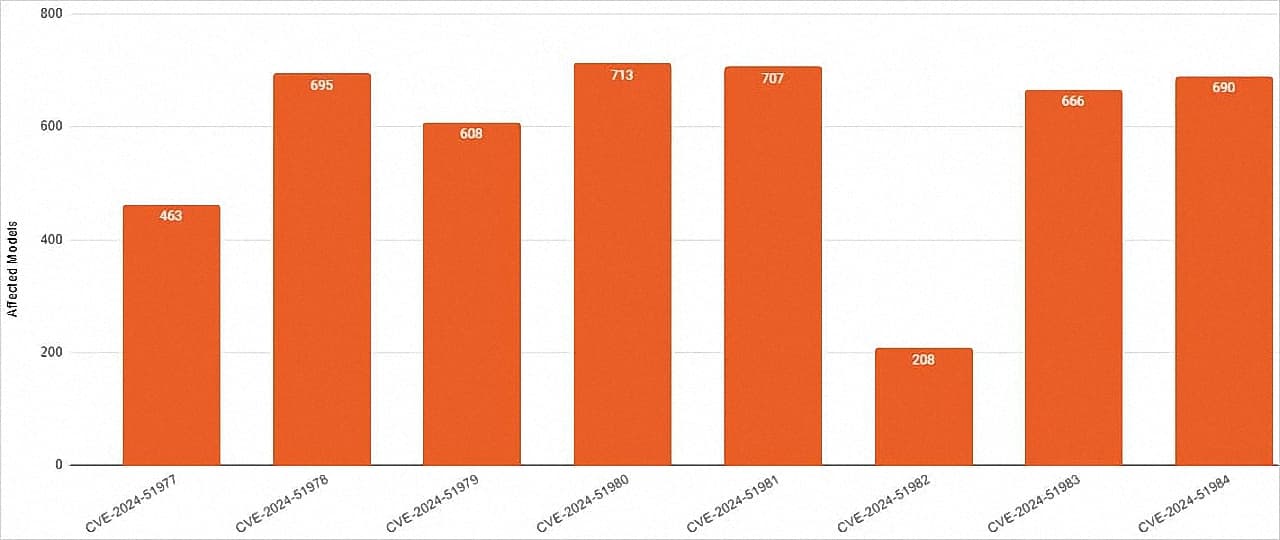 Aunque lo habrían intentado, los fabricantes no tienen capacidad para poner solución al error CVE-2024-51978 únicamente a través de una actualización de firmware. En su defecto, recomiendan un procedimiento que ayude a los usuarios a intentar aumentar la seguridad y reducir las posibilidades de sufrir problemas. Además de esto, lo que también hay que tener en cuenta es que el grupo de ocho vulnerabilidades descubiertas no ha afectado a los más de 600 equipos de una manera simultánea. Así, en un gráfico publicado por Rapid7, se puede comprobar la cantidad de modelos que se han visto afectados por cada uno de los problemas tal y como puedes apreciar en la imagen unas líneas más abajo. En el caso del CVE-2024-51978, podemos ver que ha afectado a una cantidad de 695 impresoras, por lo que se trata de un incidente importante.
