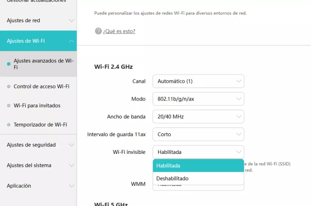 - Por último, busca la opción «Ocultar SSID» o «WiFi Invisible» (o algo similar) y actívala.