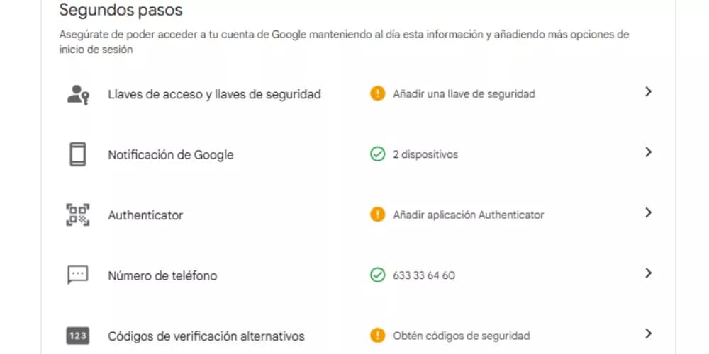 Para activarla en tu cuenta de Google, únicamente debes dirigirte a la sección «Cómo acceder a Google» usada para cambiar la contraseña y pulsar en «Verificación en 2 pasos». Desde ahí, podrás activar la función y escoger los segundos pasos que quieres que funcionen, como llaves de acceso o de seguridad, notificaciones de Google, algún servicio Authenticator, un número de teléfono o códigos de verificación alternativos.