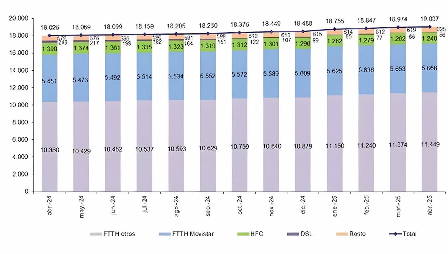 Debido al cambio de tecnología que se está extendiendo entre los ciudadanos, aunque las líneas de fibra óptica FTTH crecieron, las conexiones DSL perdieron 9.807 líneas y las HFC sufrieron una bajada de 21.788 líneas durante el mes de abril de 2025. En el caso de la banda ancha fija, las tres grandes operadoras del mercado: Movistar, Vodafone y MasOrange, han sido quienes han cubierto el 82,6% de las líneas.