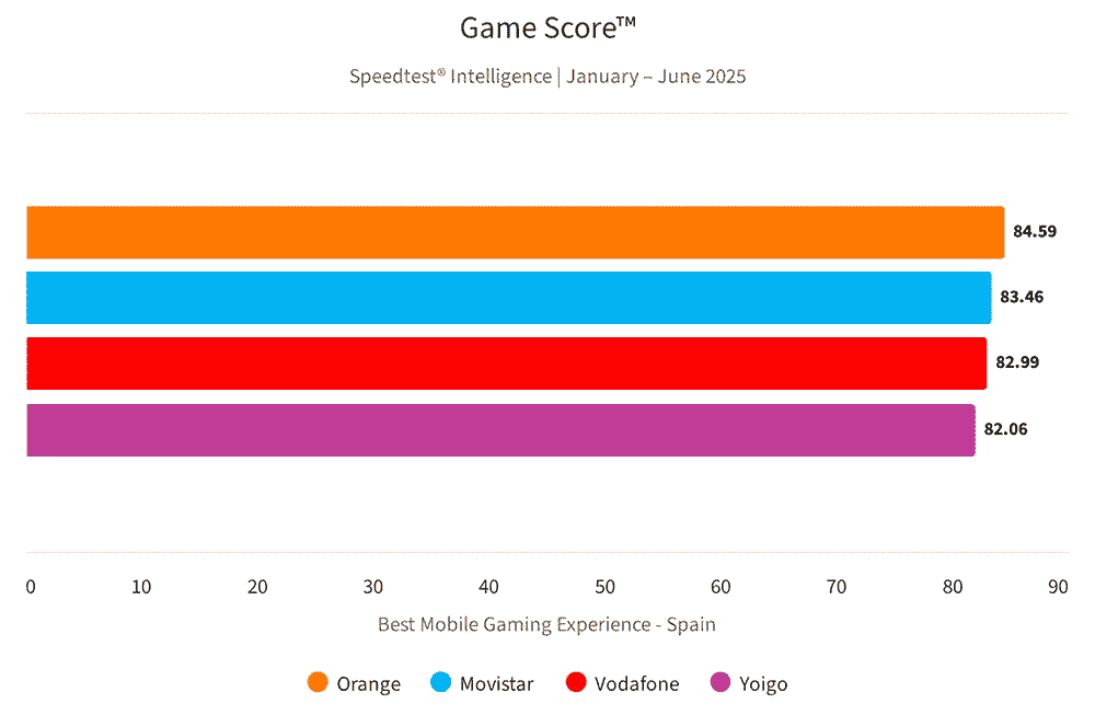 Y una de las sorpresas de este informe está justamente en la experiencia de juego. Más que nada porque Movistar no está en cabeza, sino que es el operador Orange el que ocupa el puesto número uno en este ranking con hasta 84,59 puntos, seguido del operador azul con 83,46 puntos. Después, en tercera posición, se encuentra Vodafone, con 82,99 puntos y Yoigo, en último lugar, con 82,06 puntos.