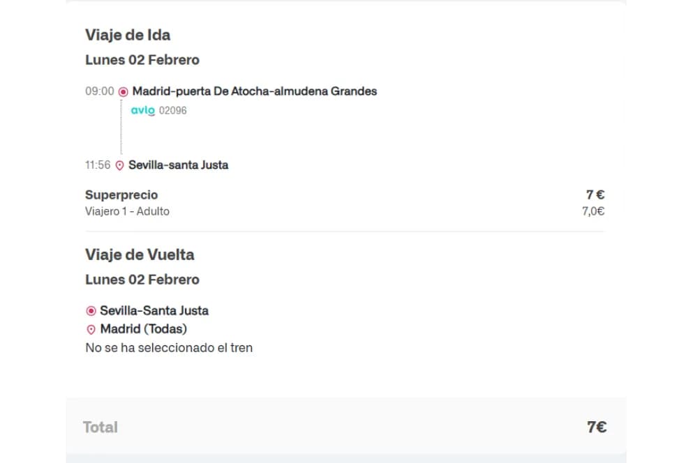 Por un lado, los desplazamientos en trenes de Avlo, correspondiente a la marca low cost de alta velocidad, irán desde los 7 euros. Como ejemplo, hemos escogido un 2 de febrero de 2026 para realizar el recorrido desde Madrid hasta la estación de Sevilla y nos ha salido como precio más bajo esos 7 euros.