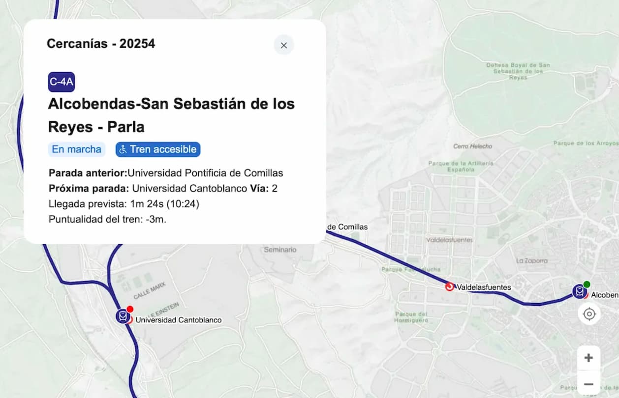 - Elige tu zona: Selecciona el núcleo de Cercanías de tu ciudad (Madrid, Barcelona, Valencia, etc.) y pulsa sobre la línea que te interesa. Al instante, verás todos los trenes en circulación moviéndose sobre el mapa.