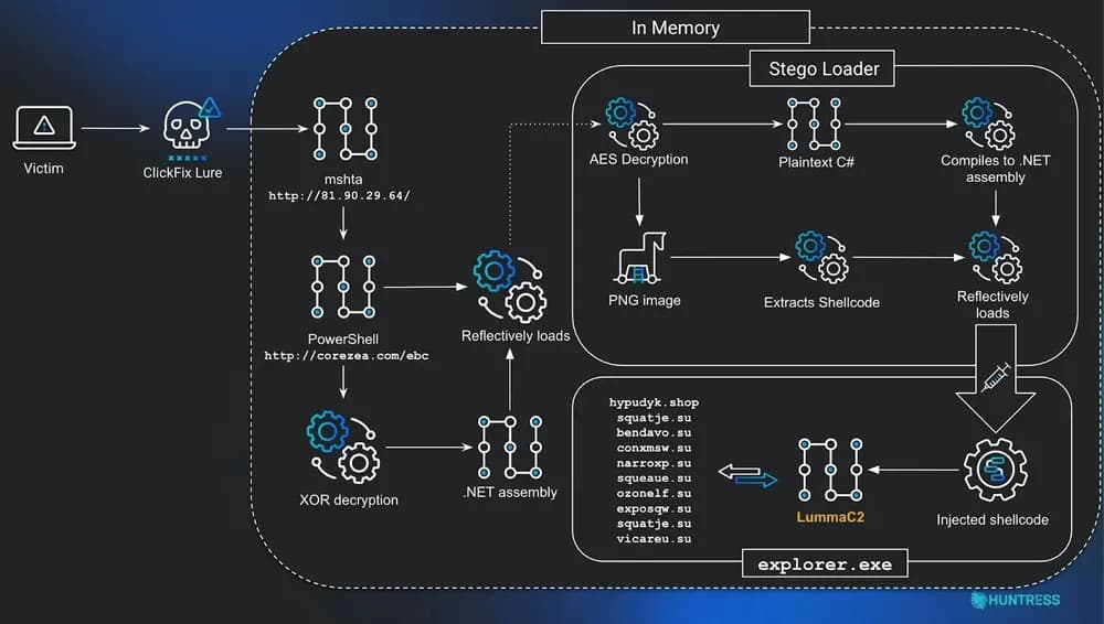 Tal y como explican los expertos de Huntress, esta maniobra que han desarrollado los cibercriminales es compleja. Utilizan lo que está considerado como esteganografía para ocultar el malware en la imagen. Por lo tanto, no se trata del uso de un archivo infectado como era clásico anteriormente.