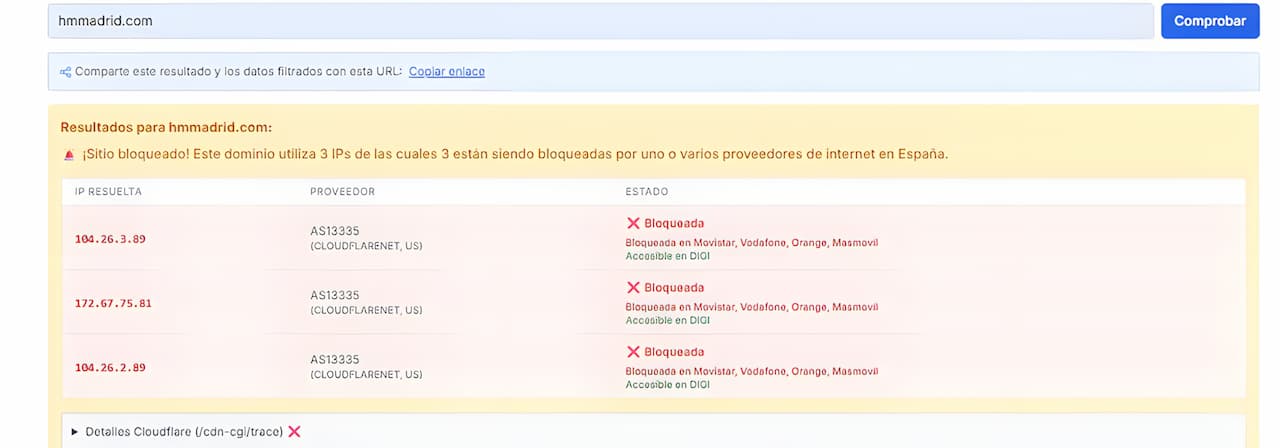 Esta web se utiliza desde hace meses para realizar una comprobación rápida de los bloqueos que pueden estar activos en cada momento. En el caso de la página del hospital, el informe de la web refleja que, en esa franja de tiempo, se encontraba bloqueada por Movistar, Orange, MásMóvil y Vodafone.
